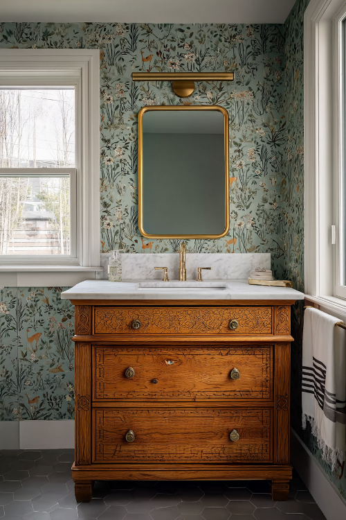 This bathroom makes me smile. Botanical wallpaper in soft green wraps the walls. A real wood dresser with carved detail becomes a vanity, topped with marble. The mirror is modern with a simple brass edge and a single brass light bar above it.