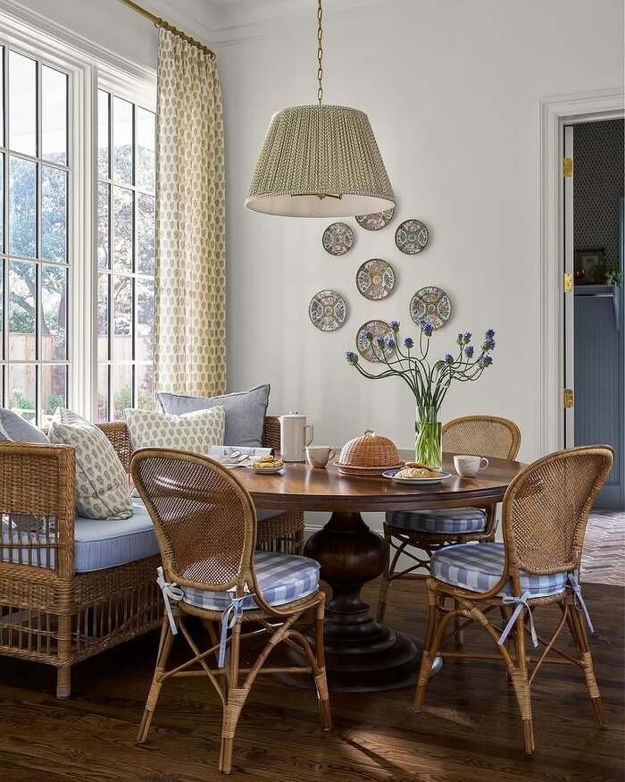 1) Cozy wicker nook with a plate wall that feels like Sunday morning