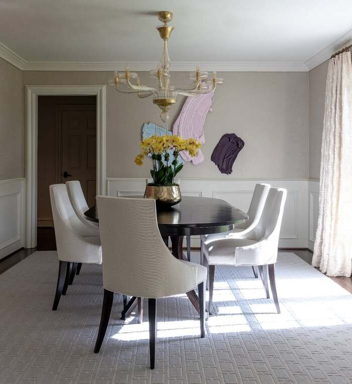 Soft abstract art in a neutral dining room that still feels personal