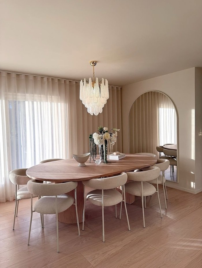 This one is gentle and glowy and I wish my dining room always looked like this at 4 p.m. The wall decor for dining room here is the huge arched mirror. It makes the room look taller, wider, and brighter. The mirror also repeats the soft curves of the chairs and the oval table, so everything feels smooth and calm. And those sheer curtains? They’re like a filter in real life.