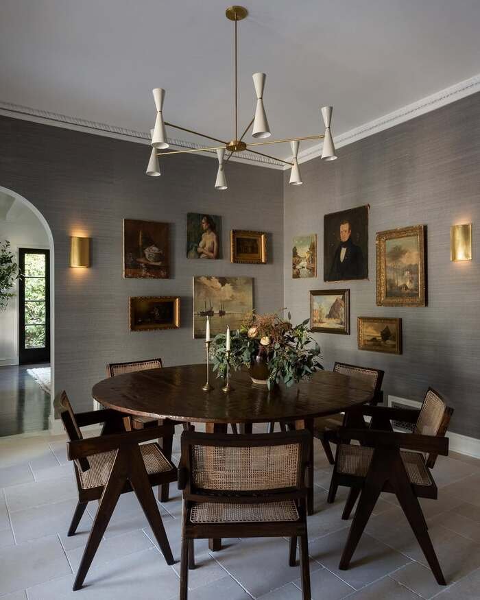 This one made me stop scrolling. The dining room is dark and serious in a good way, with a bunch of framed paintings in gold frames. This wall decor for dining room is basically a “gallery wall,” but it feels fancy because of the classic art and the way it’s spaced. It’s like a little museum, but still a room you can sit in.