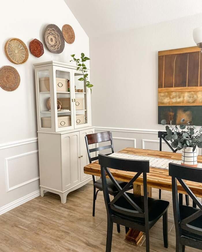 This room is calm and light, and the wall decor for dining room is a group of woven baskets hung above a cabinet. It’s such a smart move because texture makes a room feel cozy, even if the colors are basic. Also baskets are usually cheaper than big framed art, which I appreciate a lot.