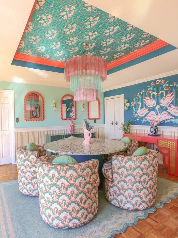 This room is fearless. The ceiling has a bold pattern, the walls have a mural vibe, and the colors are playful but still kind of classy. The wall decor for dining room here isn’t just frames. It’s the whole room being the art, which is honestly impressive.