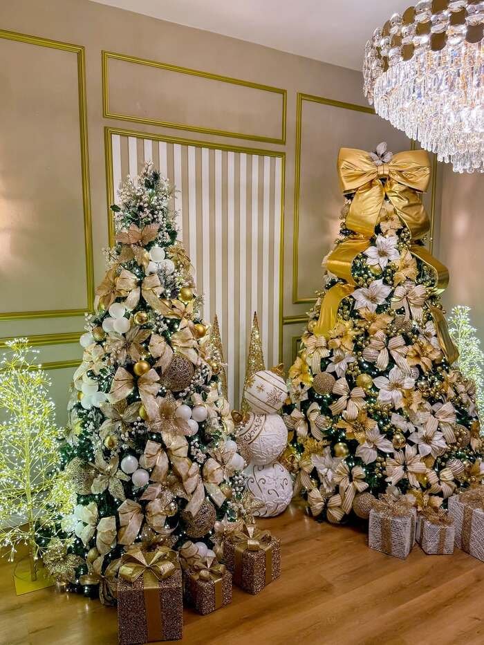 White and Gold Christmas Decor: Double-tree glam with big bows