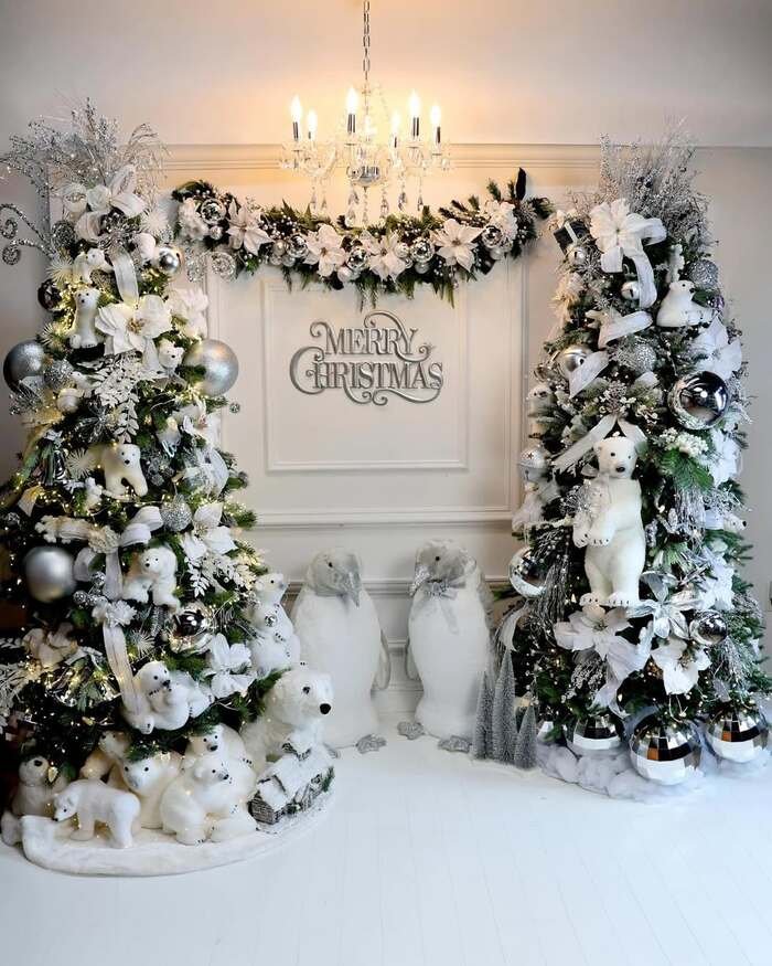 I wasn’t prepared for how cute two themed trees could be until I met this polar menagerie. The base is fluffy “snow,” then white bears and penguins climb through the branches like they live there rent free. Keep your palette strict. Use white poinsettias, silver tinsel, and a few chrome ball ornaments so the animals remain the stars. I wire each plush by a paw or scarf so they don’t slip. If you hate visible wires, wrap them with a tiny ribbon scrap. Add a frosty garland and a chandelier-style topper to echo the sparkle above the trees. The result feels whimsical and grown up at the same time, which is honestly rare.