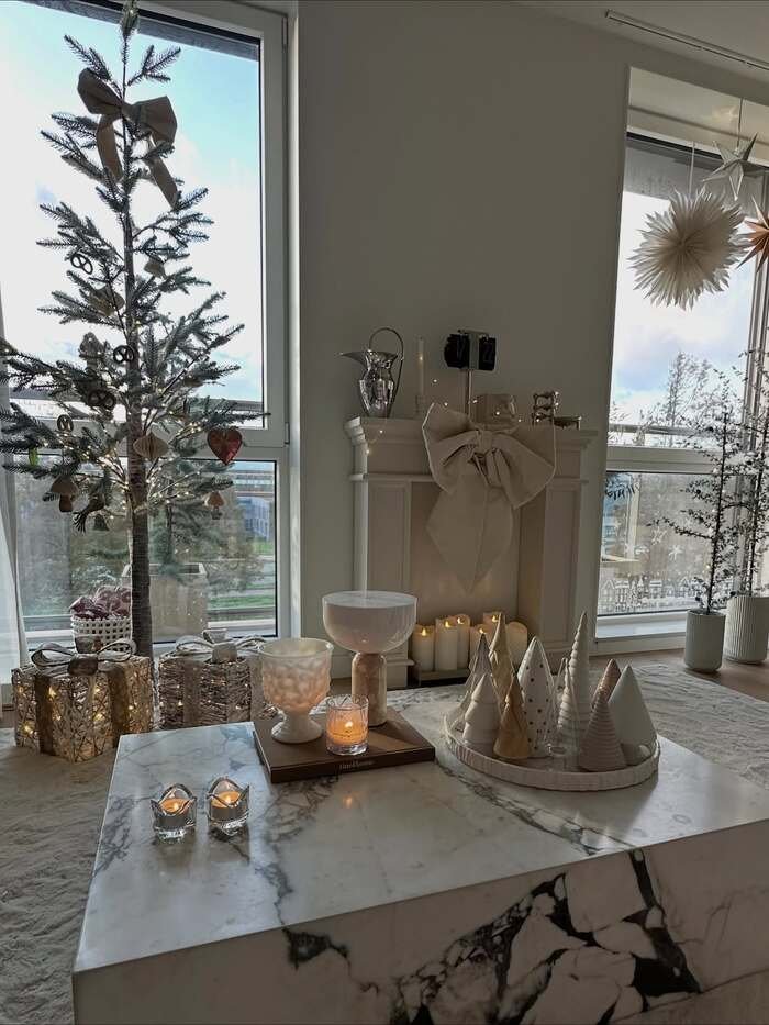 This one proves a skinny tree can carry a whole room. The branches are sparse, the ornaments are natural, and the vibe is peaceful. Start with kraft paper hearts, wooden stars, and one oversized linen bow at the top. Set a tray of cone trees on the coffee table in white, cream, and soft gold, then repeat candles everywhere. Battery pillars in a fireplace niche make the coziest faux hearth. The low light hides mess and makes everyone whisper for some reason.