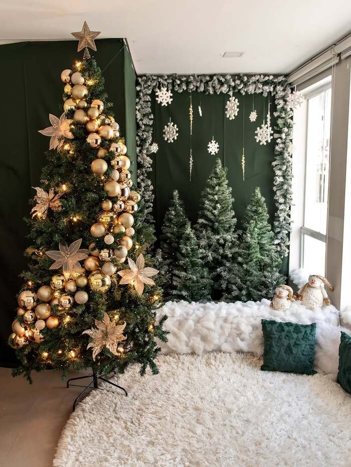 Talk about drama. A dark green wall behind the tree becomes instant theater. I pushed all the champagne and gold baubles to one face of the tree, kind of like a comet tail, which makes the shape feel taller. Metallic poinsettias fill gaps and add floral movement. In the background, several small trees and falling snowflake ornaments create a layered forest. Use cotton batting or quilt stuffing along the floor to make an easy “snowbank” that hides cords and stands.