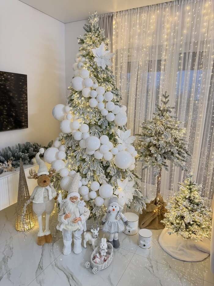 The most magical detail here is the bubble garland. It’s just white ornaments of different sizes threaded on fishing line and draped around a flocked tree. Scatter a few white poinsettias to soften transitions, then place sweet figurines at the base. If you have kids, this is their stop-everything tree. The bubbles glow like moon pearls when the warm lights hit, which is a wild sentence but true.