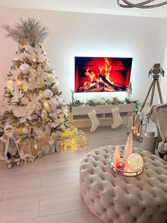 This setup is totally do-able on a weeknight. A fluffy tree with white magnolias and silver ribbons sits next to stockings and lanterns. The sneaky hero is the TV playing a fireplace loop. It throws warm light across the room and fakes that mountain-lodge feeling, even if you live on the 8th floor like me. Add a tufted ottoman tray with two tiny cone trees and a patterned candle to carry the palette to the center of the room.