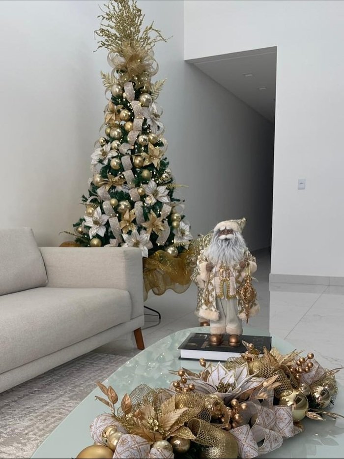 This idea is the friendliest of the batch. The tree uses big bows, matte and shiny gold balls, and tucked-in white poinsettias. The topper is light, a burst of airy stems, so nothing sags. On the coffee table, echo that mix with a low arrangement of ribbon loops, metallic leaves, and a few ornaments. The repetition makes the entire room feel styled without a lot of effort.
