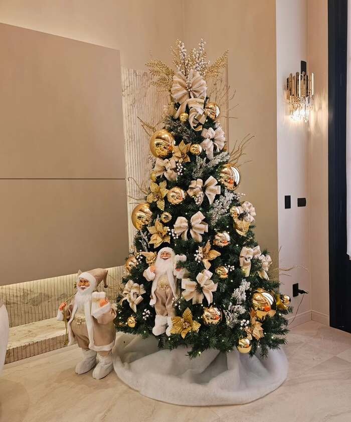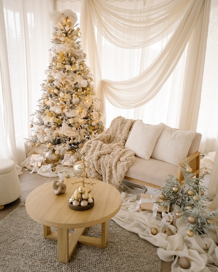 Not all gold is glitzy. This tree uses caramel, latte, and soft champagne with ivory berries and tiny white blooms. The base is burlap bunched like a skirt. I loved how it warmed a modern room without fighting the clean lines. Use satin-finish ornaments in caramel and cinnamon shades as your bridge between green branches and metallic gold pieces. It’s especially pretty in daylight.