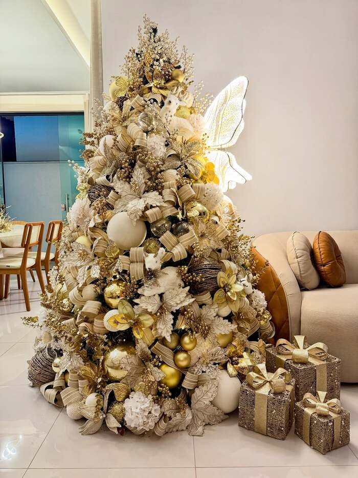 I can’t lie. I thought butterfly ornaments were cheesy until I saw this tree. The secret is scale. Use a few large LED wing motifs instead of many small ones. Add giant white rosettes made from tutu fabric or coffee filters. Scatter matte white orbs between. Keep the gold touches tiny, like bead picks and micro baubles, so the wings stay the star.