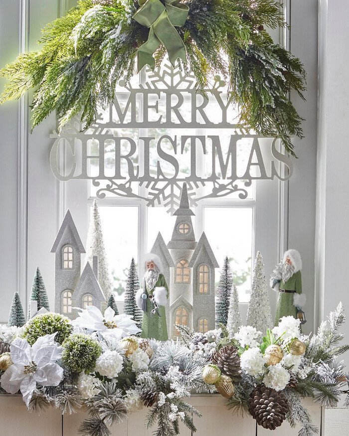 Not every idea needs a tree. This window scene shows a mini village with frosted trees, pine cones, and white hydrangeas. The surprise is soft green. I used sage bottlebrush trees and two tiny Father Christmas figures in mossy coats. White houses with LED tea lights glow at night. It’s a quiet setup, perfect for a kitchen window or entry console.