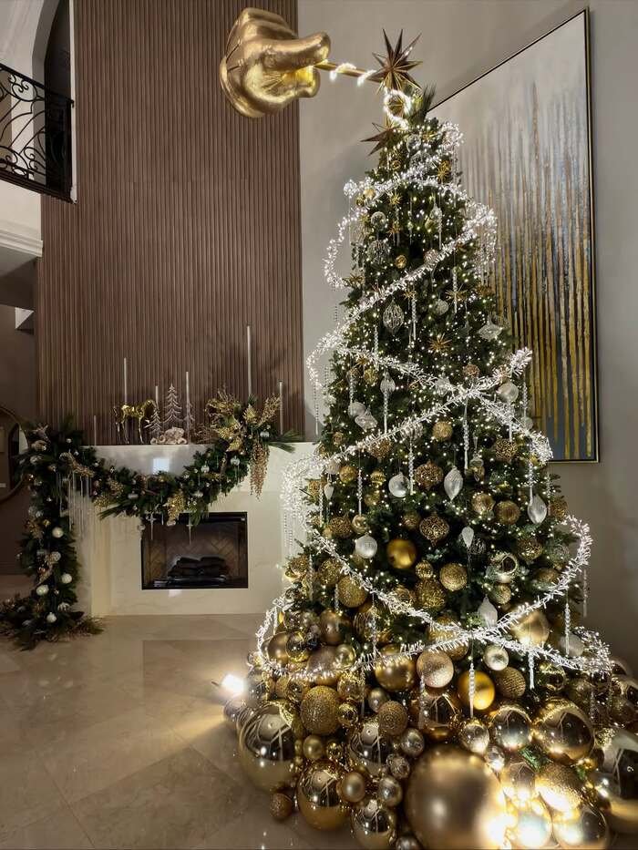 This is the showstopper for tall spaces. A spiral of twinkle garland wraps around the tree, and there’s a literal gold-and-white ornament “spill” that pools on the floor like bubbly champagne. I built the spiral by pinning a strand of fairy lights to the top, walking it around the tree in even gaps, and securing with floral wire every 8 inches. Then I layered icicle drops and metallic ornaments along that path to emphasize the swirl.