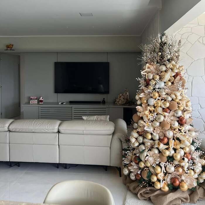 This living room tree mixes white mesh ribbon, glittered leaves, and big champagne ornaments. What I love is the chunky texture near the base. There are oversized spheres sitting on the floor like they rolled out of the branches. I copied this using plastic yard ornaments from the hardware store. They’re light, cheap, and don’t break. Group them by the stand, then wrap a white knit blanket around for a casual skirt.