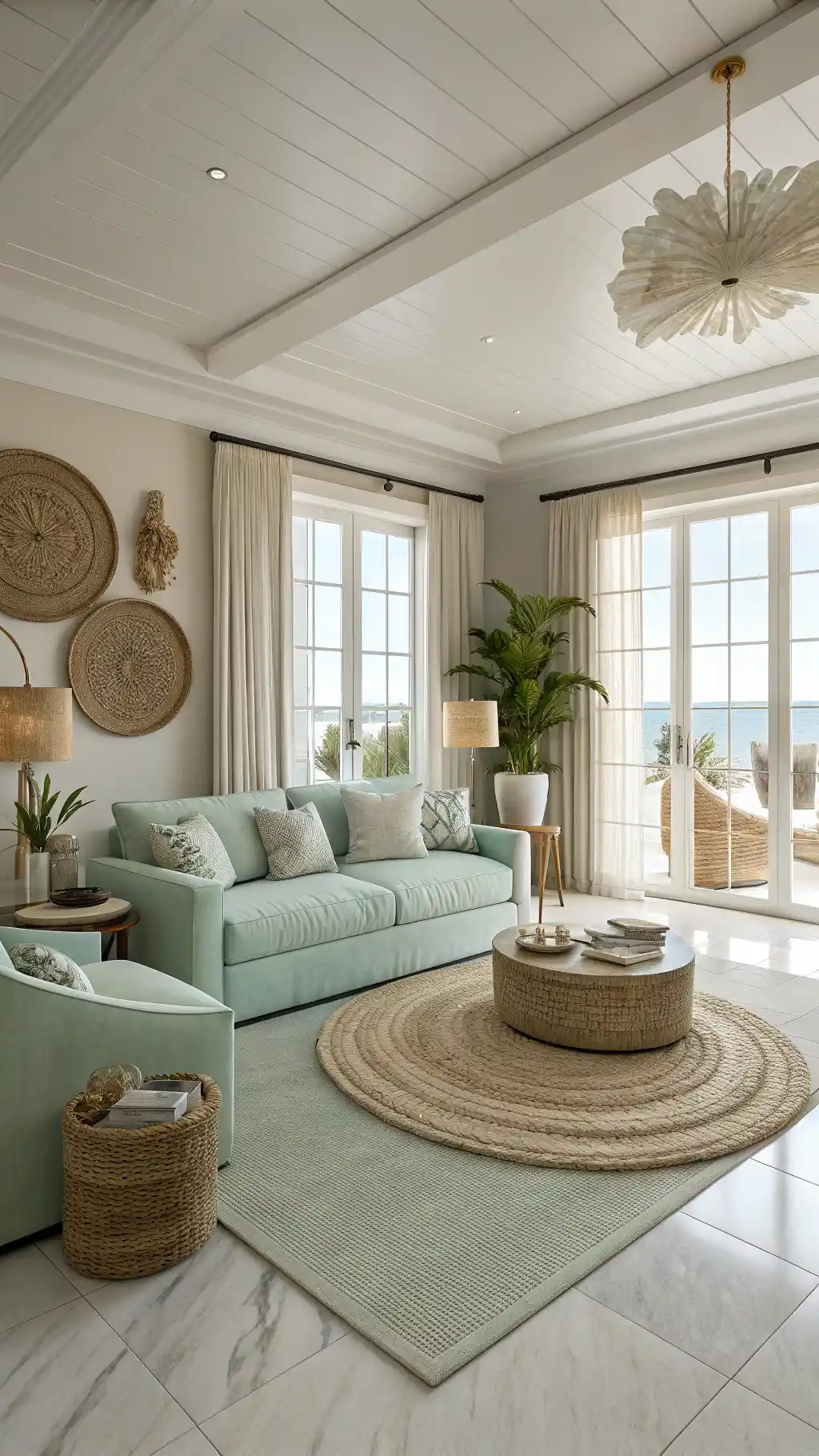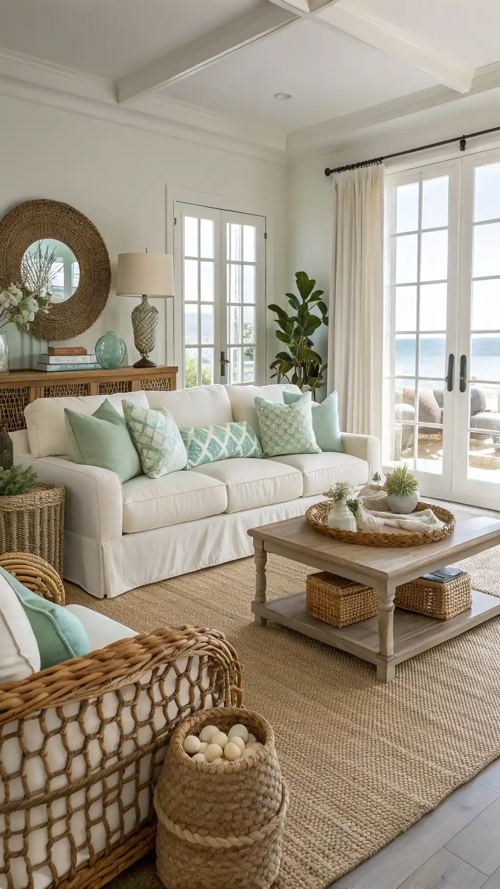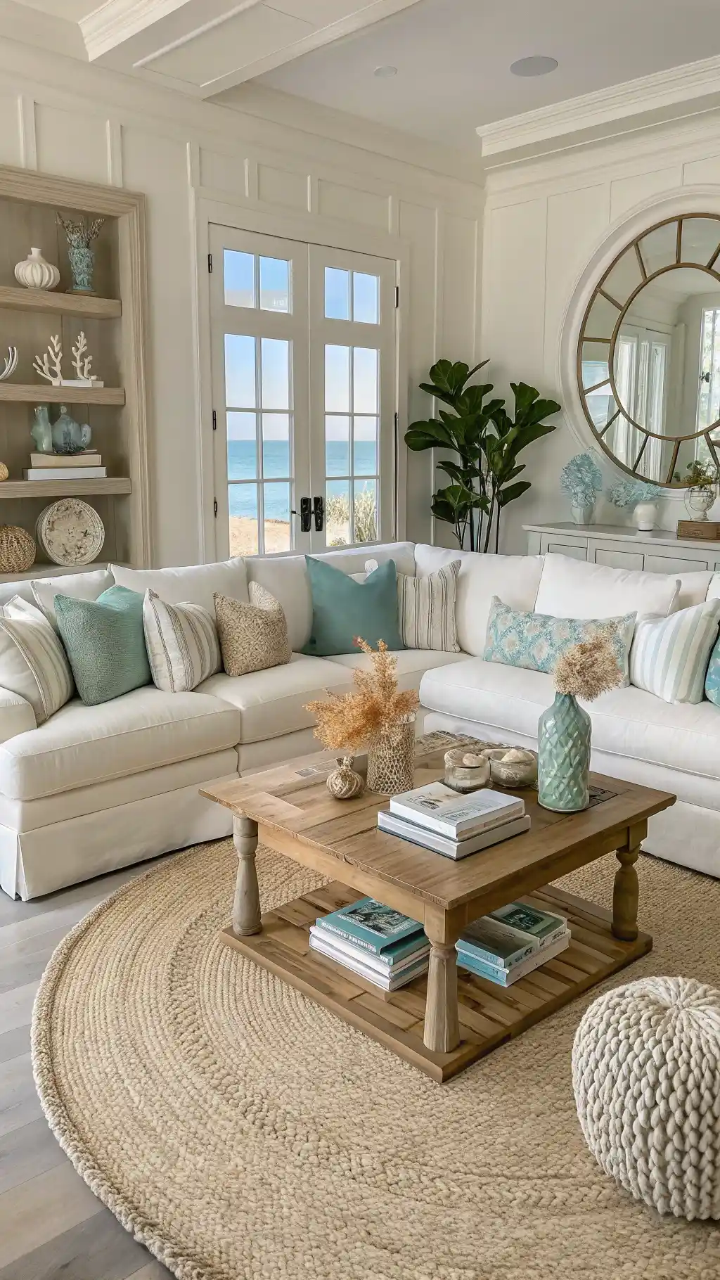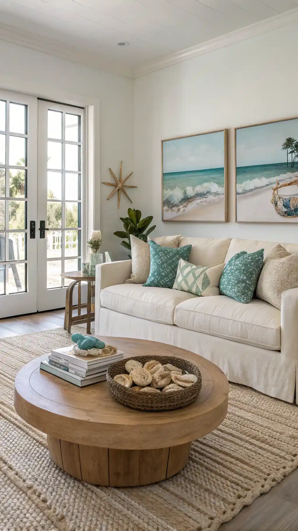 My go-to trick is incorporating neutral tones with pops of seafoam green or sandy beige. For example, a plush linen sofa instantly adds comfort. Then, adding elements like driftwood sculptures or seashell-filled vases brings the outdoors in. A large jute rug helps ground the space and create a sense of coziness.