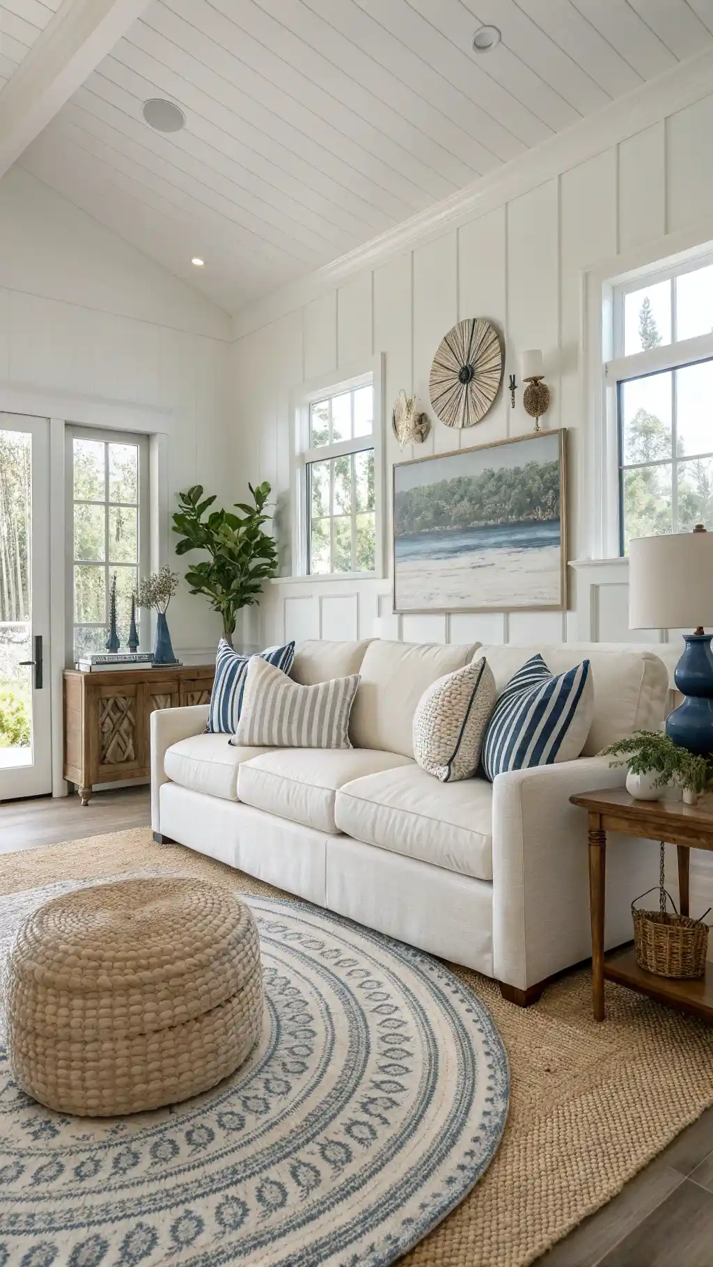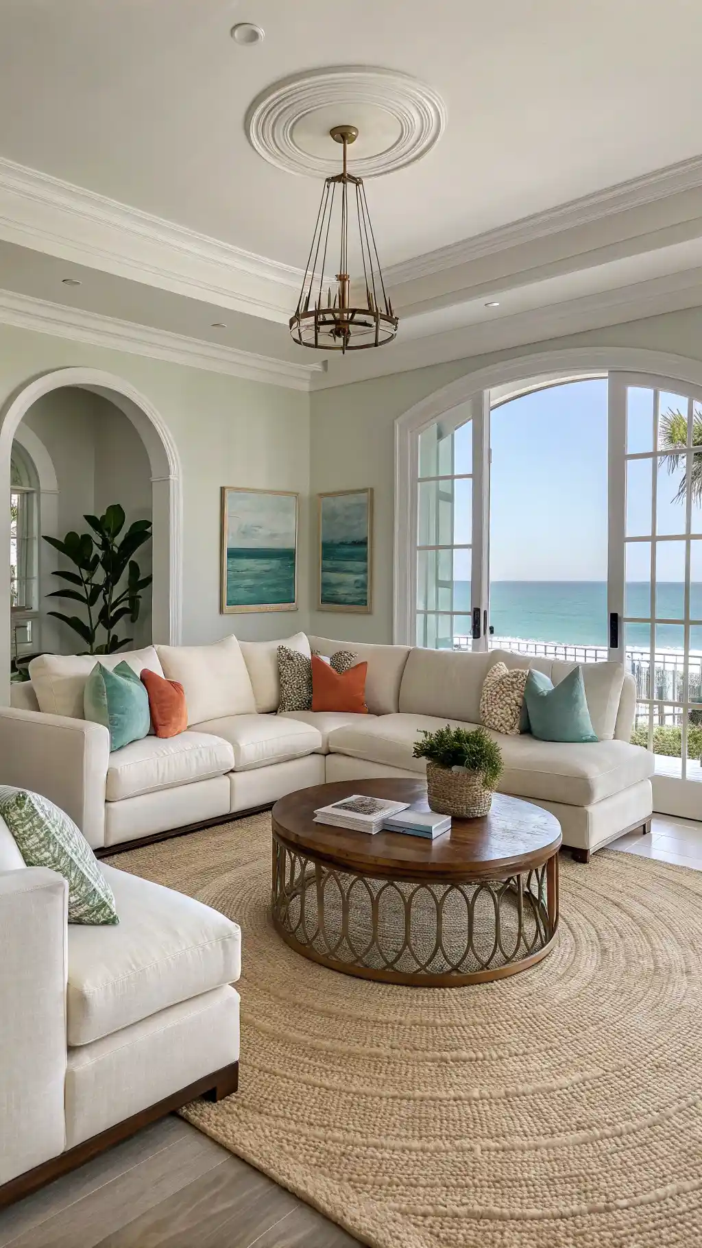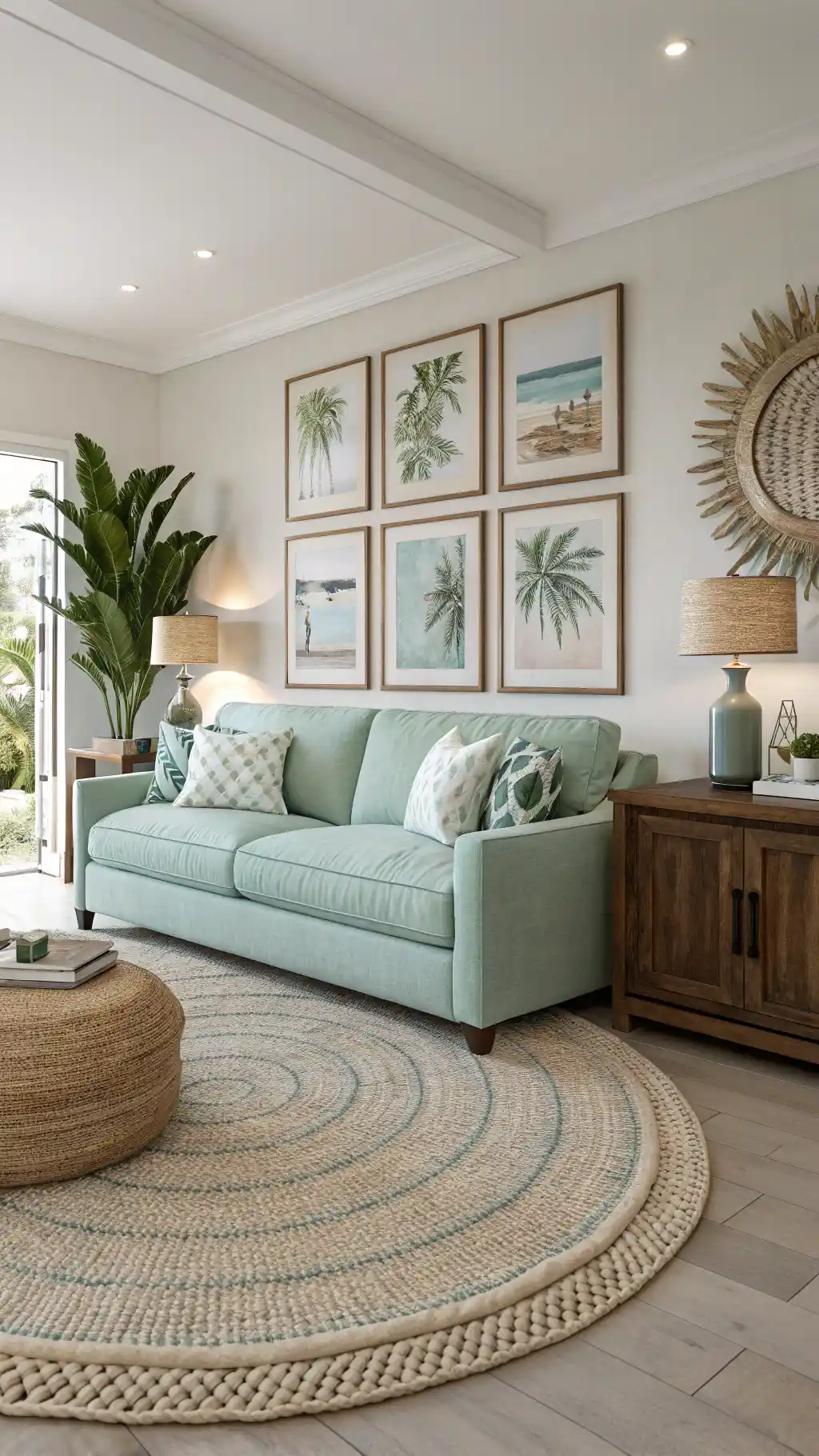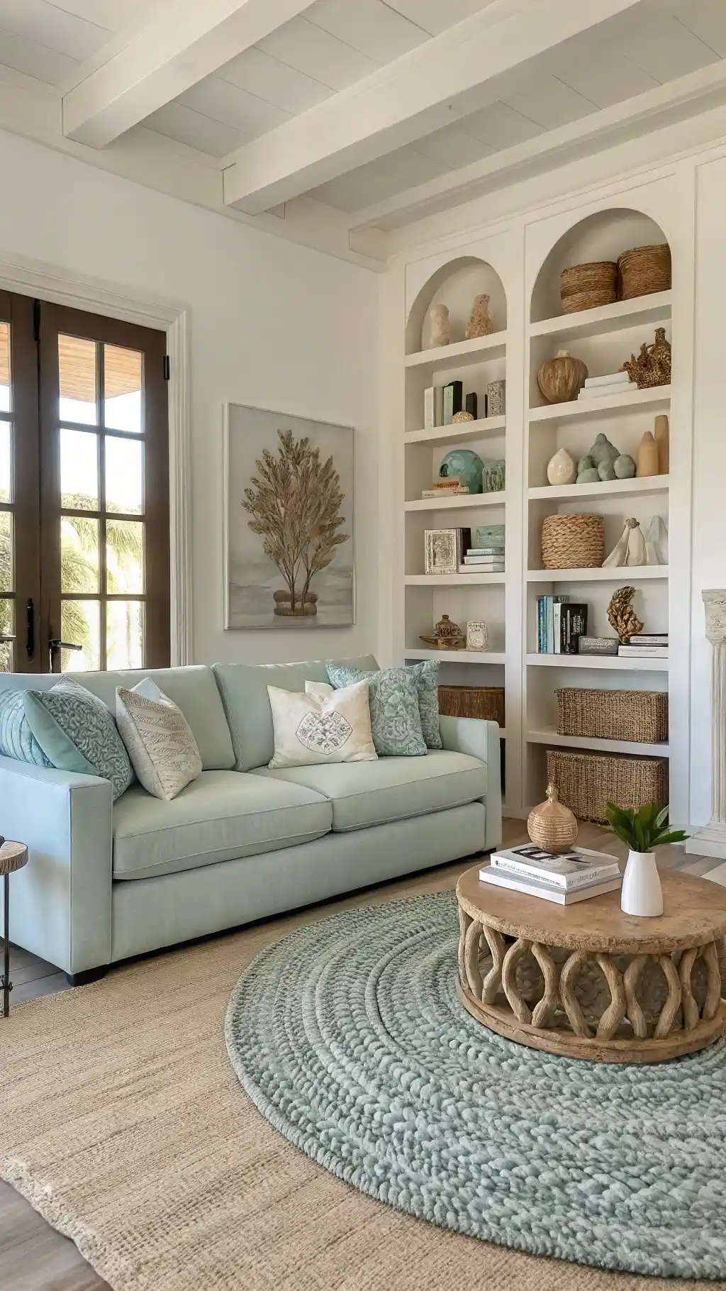My go-to trick is incorporating neutral tones with pops of seafoam green or sandy beige. For example, a plush linen sofa instantly adds comfort. Then, adding elements like driftwood sculptures or seashell-filled vases brings the outdoors in. A large jute rug helps ground the space and create a sense of coziness.