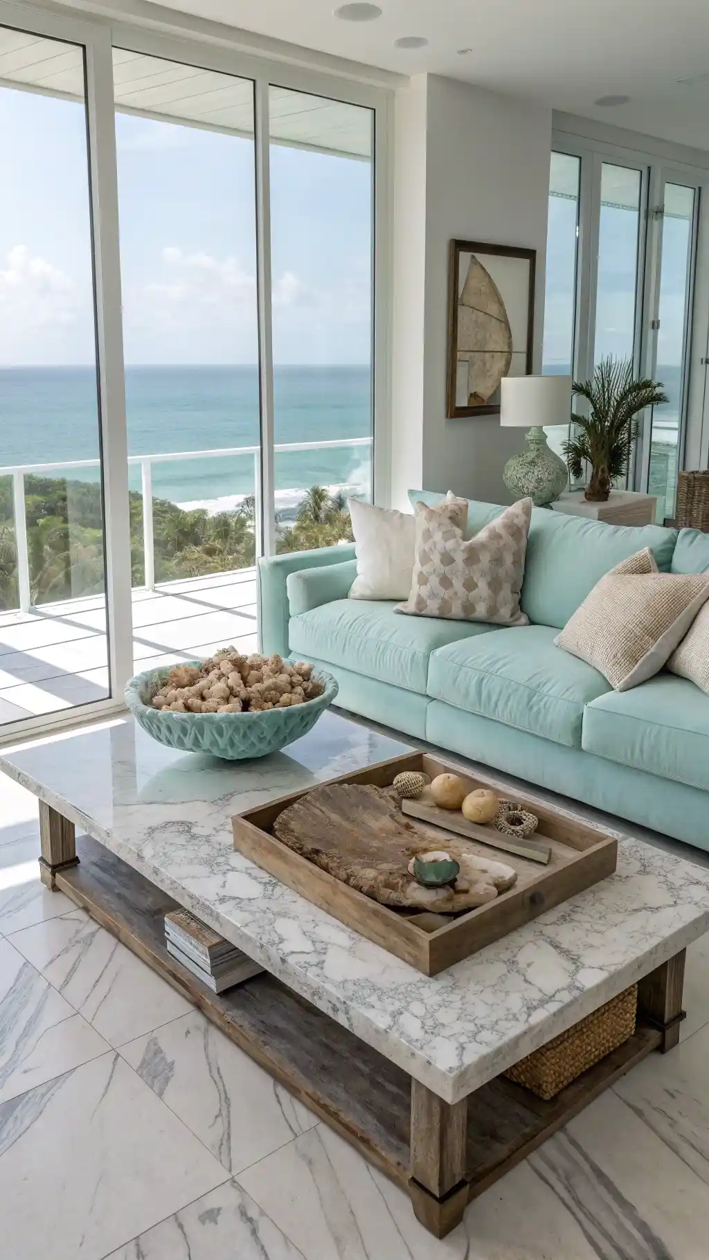 To enhance the coastal vibe, I'd incorporate decorative pillows in serene shades of seafoam green, sandy beige, and crisp white. A weathered driftwood coffee table adds organic texture, topped with a curated collection of ceramic shells and a vintage glass cloche. The key is balance – letting the marble shine while adding elements of natural texture.