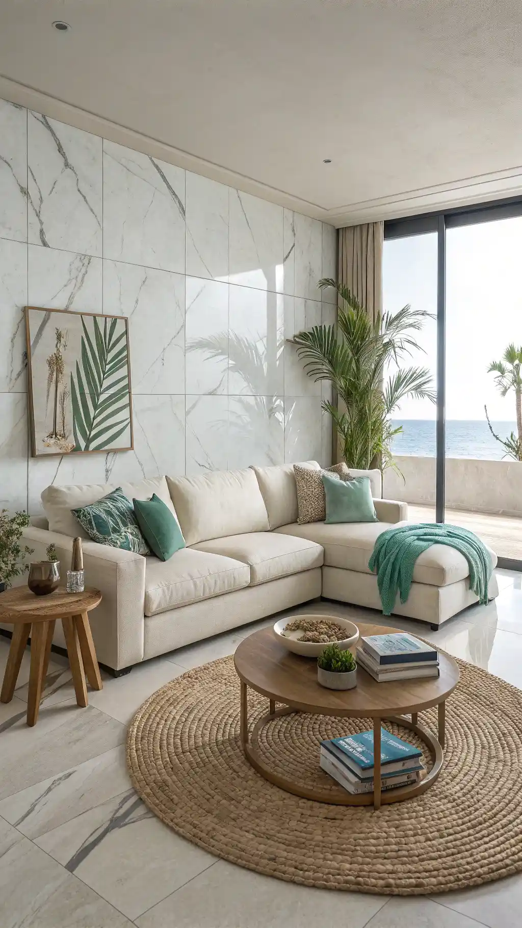 So, you've got a stunning white and grey marble tiles living room – fantastic! Marble provides such a luxurious foundation. I've been thinking a lot about how to soften the coolness of marble, and my latest inspiration is bringing in a touch of the coast.