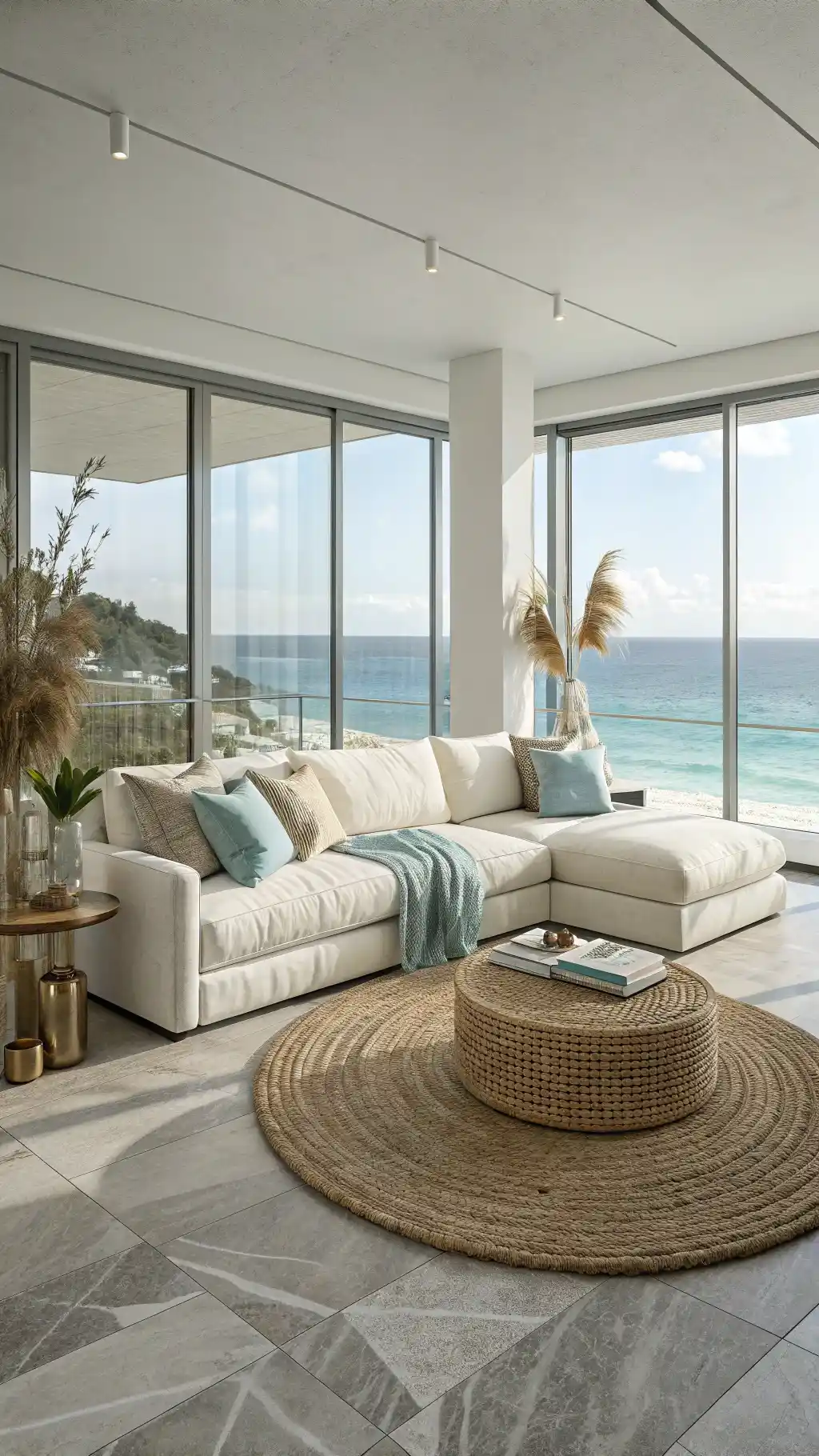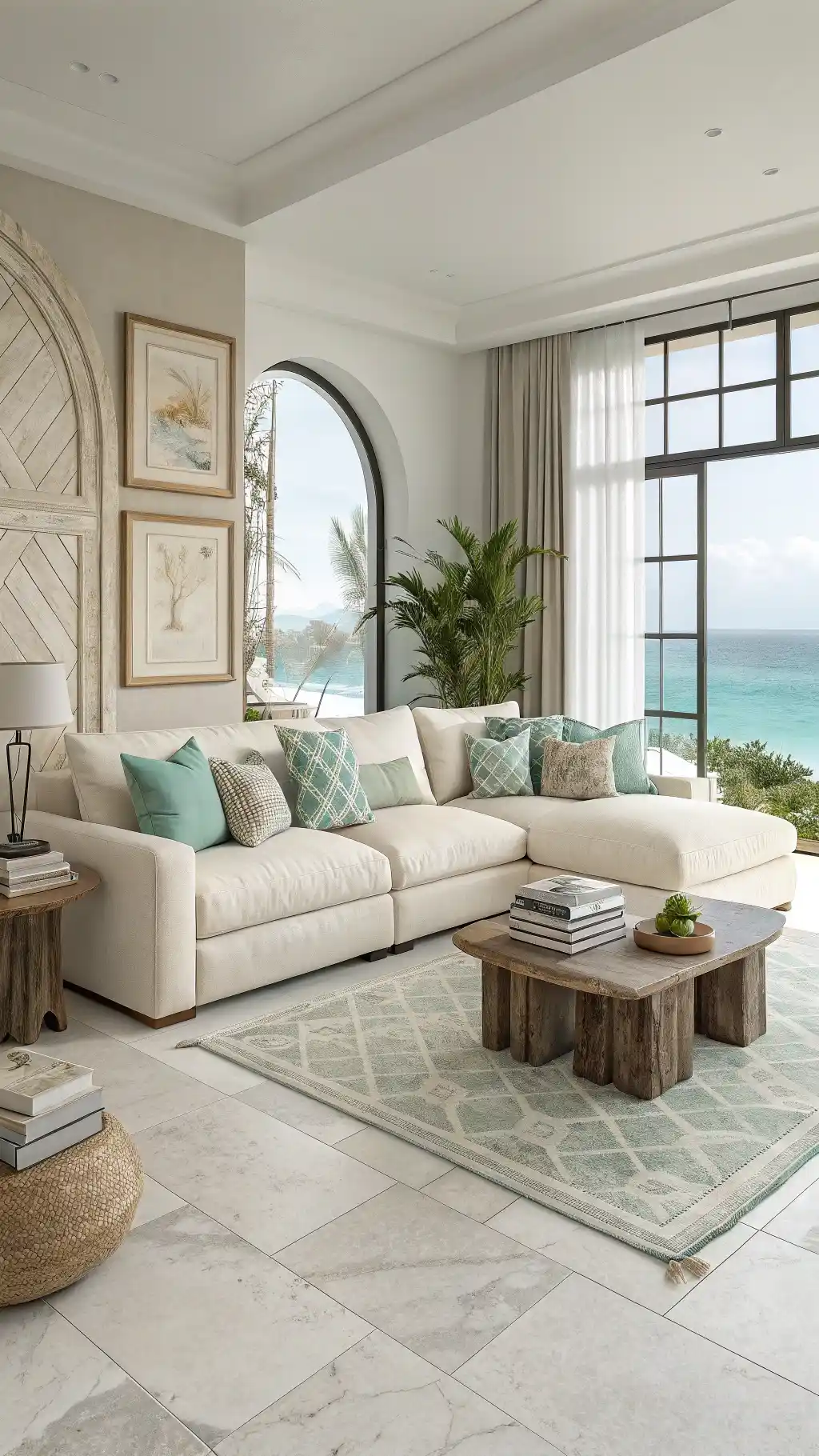 The key is to soften the cool tones of the white and grey marble tiles. I achieve this with natural textures – think linen, jute, and driftwood. The ivory sectional creates a warm contrast against the marble, inviting relaxation. Adding pops of seafoam green and sandy beige echoes the ocean and beach hues.