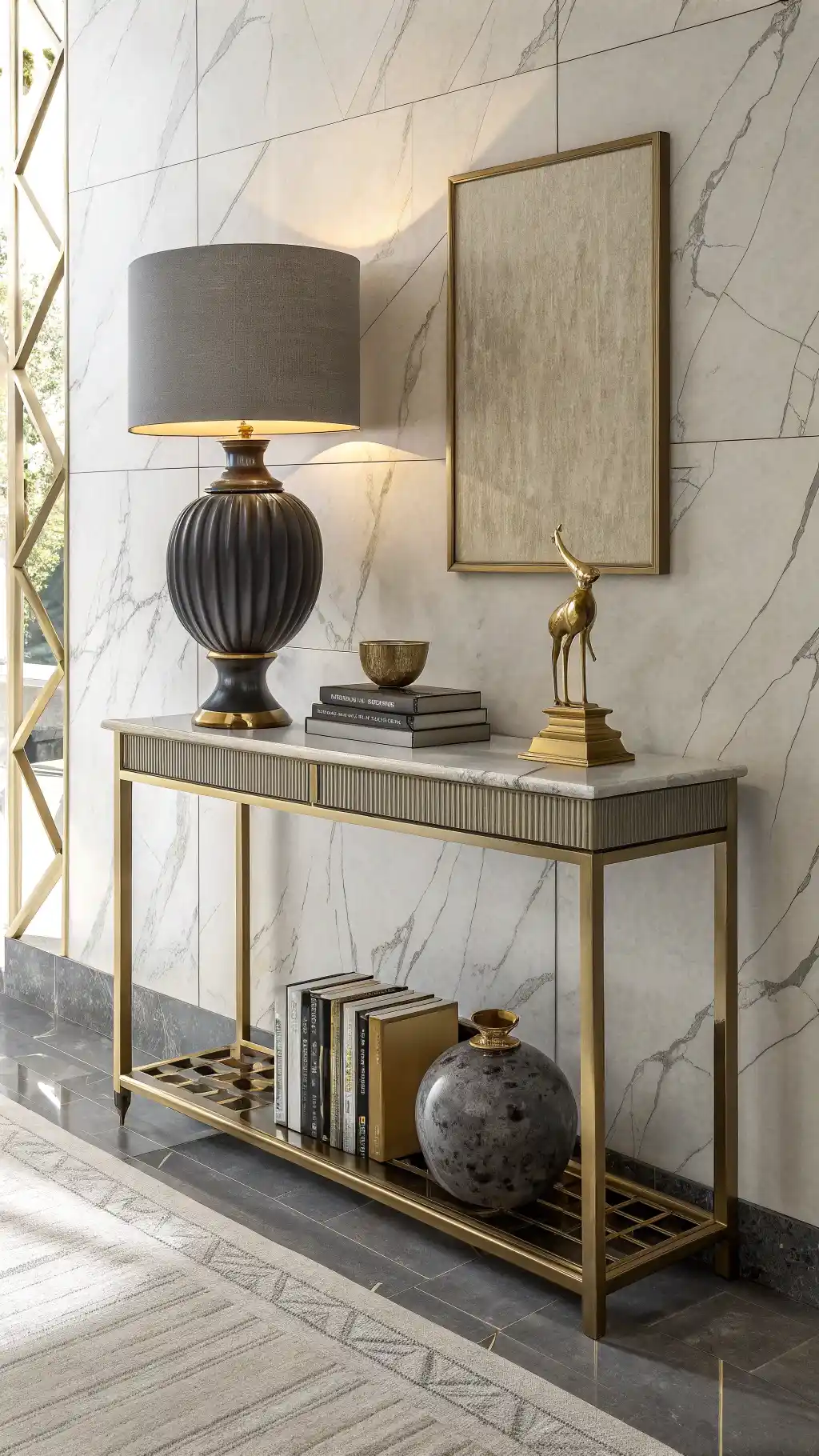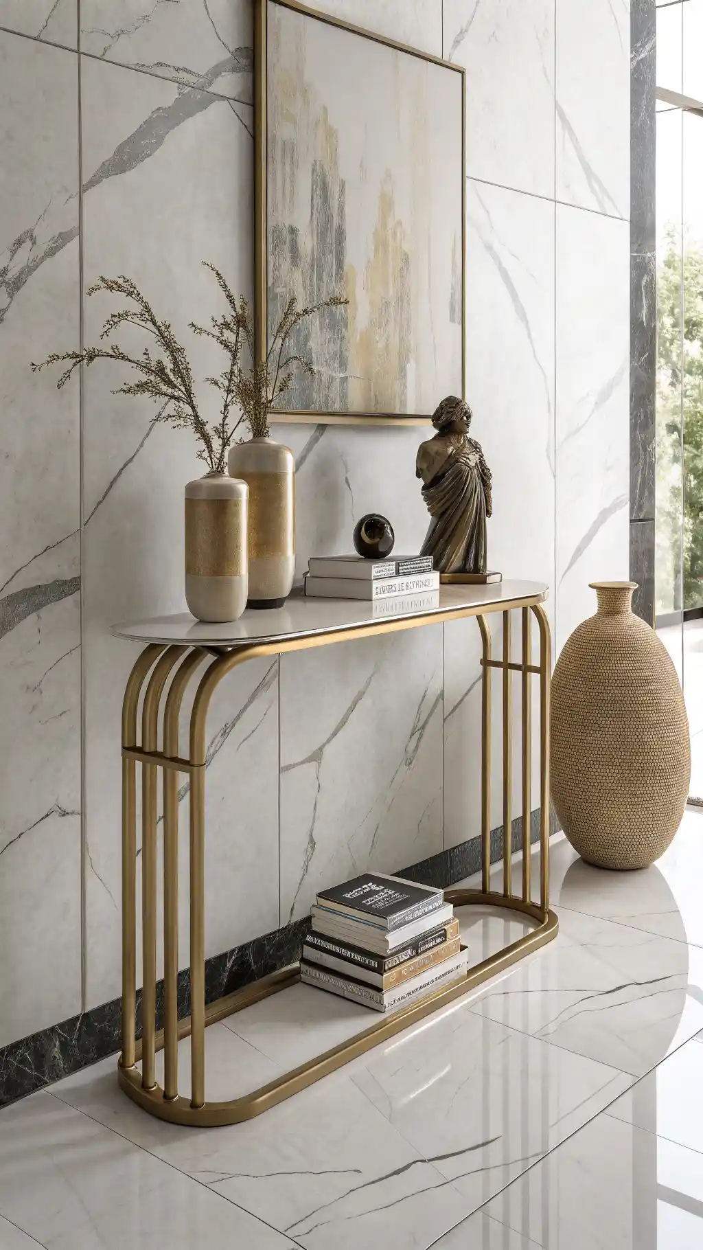 I'm so excited to share this latest design idea! When working with a white and grey marble tiles living room, I always think about adding a touch of warmth and luxury. This starts with a statement console table. I've chosen a sleek brass console – the metallic tones act as a beautiful contrast to the cool marble.