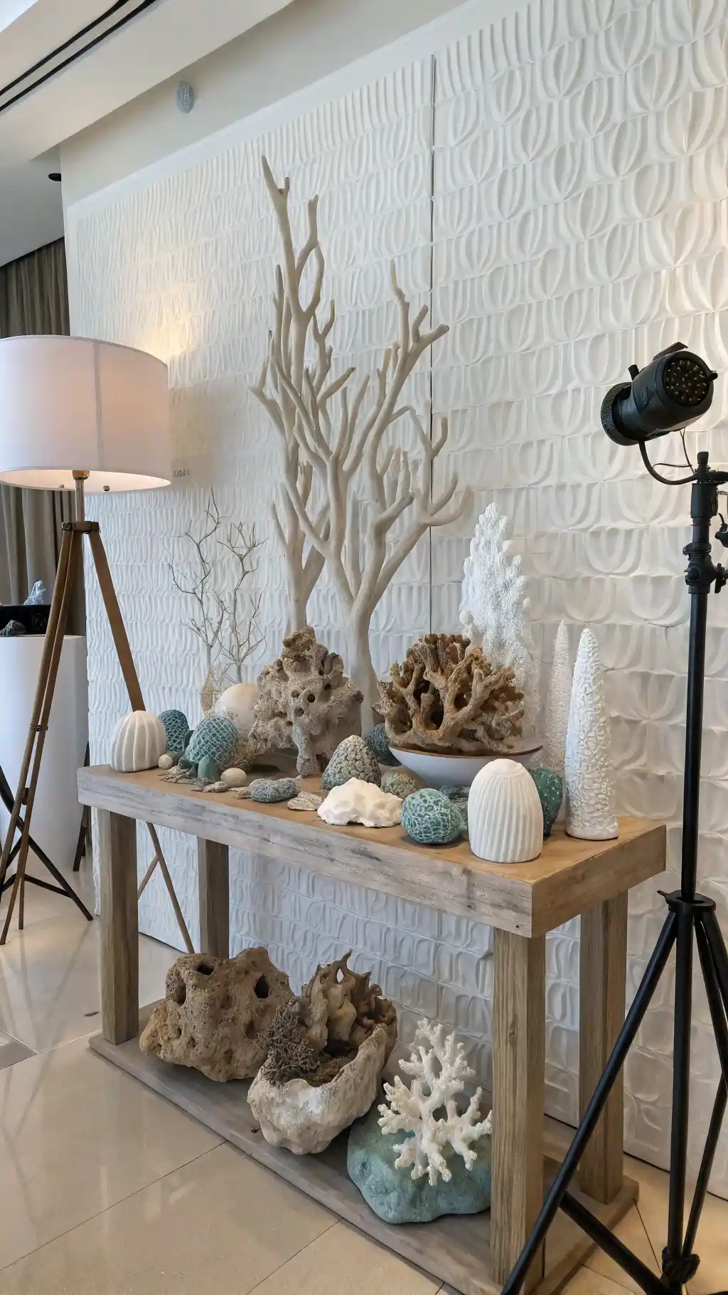 - A weathered driftwood console table with ceramic coral and sea glass accents.