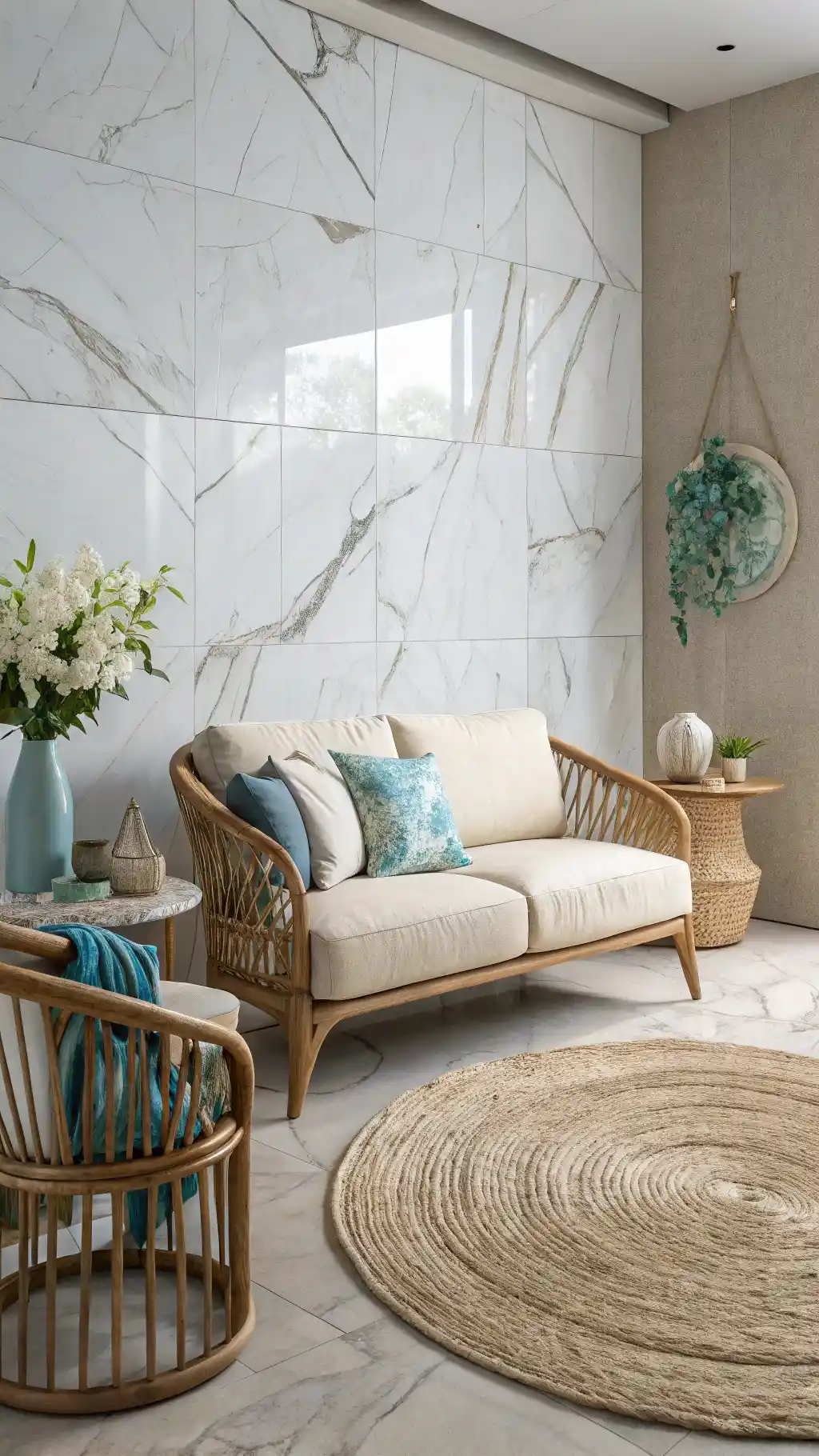 I’m envisioning a corner setup that introduces a touch of the seaside. A comfy cream-colored sofa provides a soft, inviting base. A round jute rug grounds the seating area, adding warmth and definition. To complement the marble, a woven rattan armchair instantly injects a casual, coastal feel.