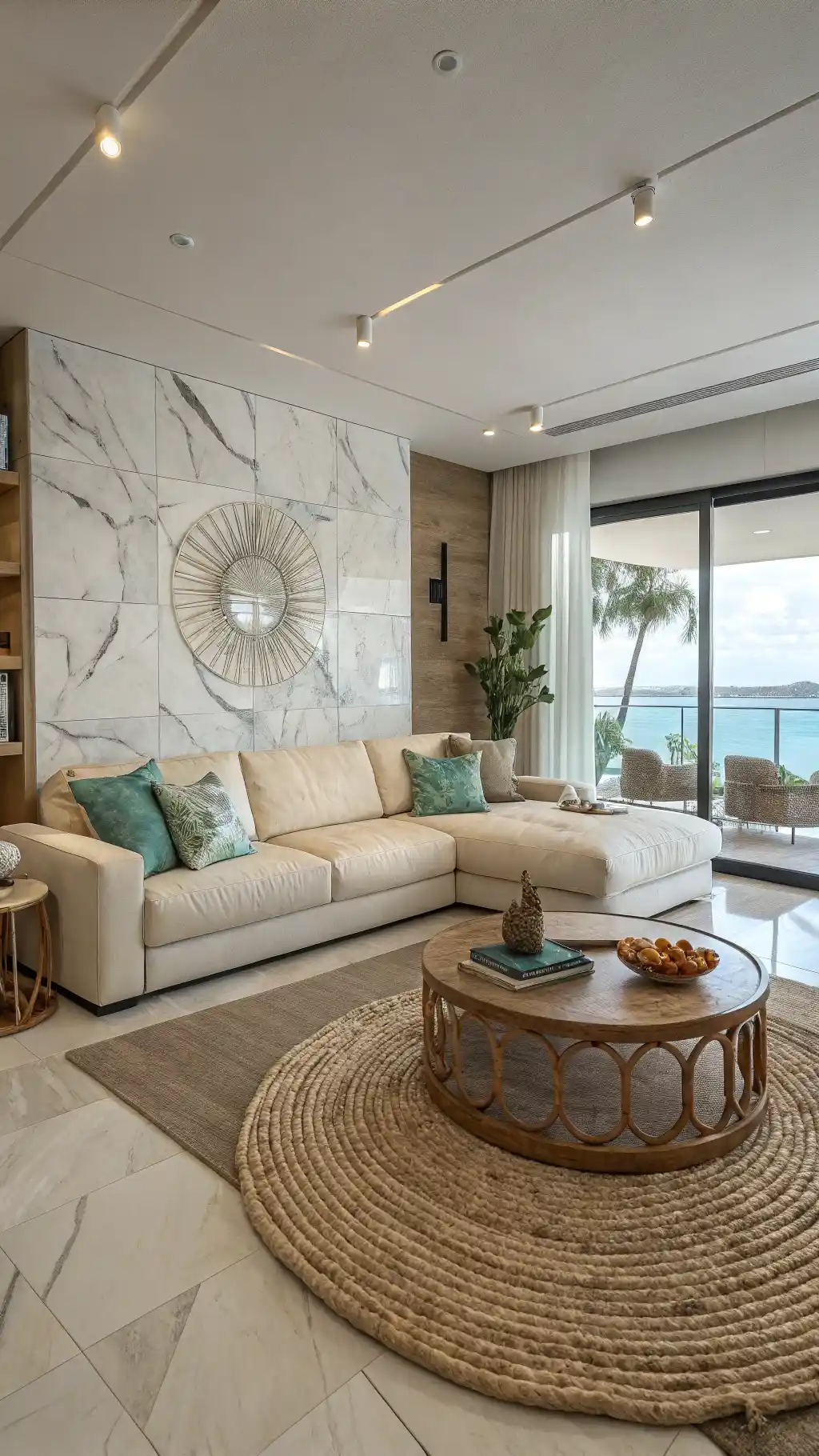 I love layering textures. The plush sofa, woven rug, and smooth sea glass create a tactile experience. A few thoughtfully placed decorative accents, like coral and botanical prints, enhance the coastal theme without feeling overly kitschy. This white and grey marble tiles living room design is all about creating a tranquil sanctuary. It’s a space where you can unwind and feel connected to the natural world.