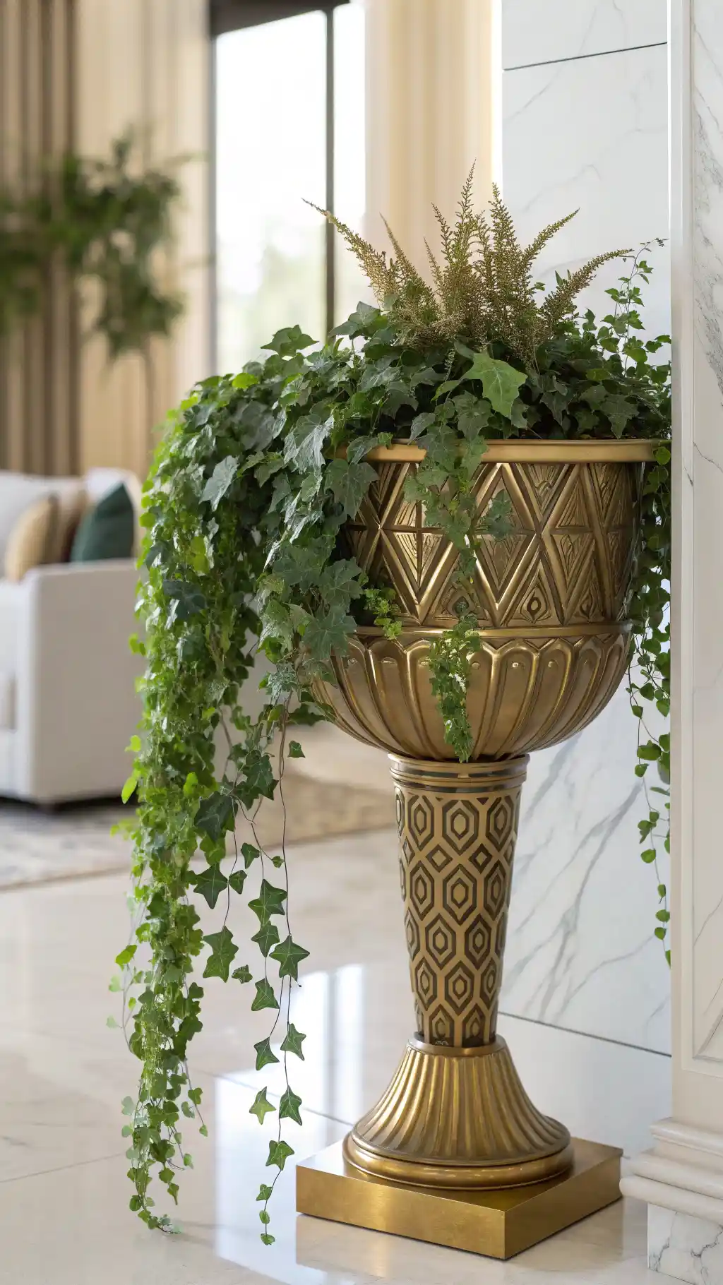 The contrast between the cool marble and the warm brass and vibrant green is just incredibly eye-catching. I would place this setup on a low coffee table or a console table against the marble wall. It works beautifully in a living room with plenty of natural light. Room placement ideas: coffee table center, console table accent, side table vignette.