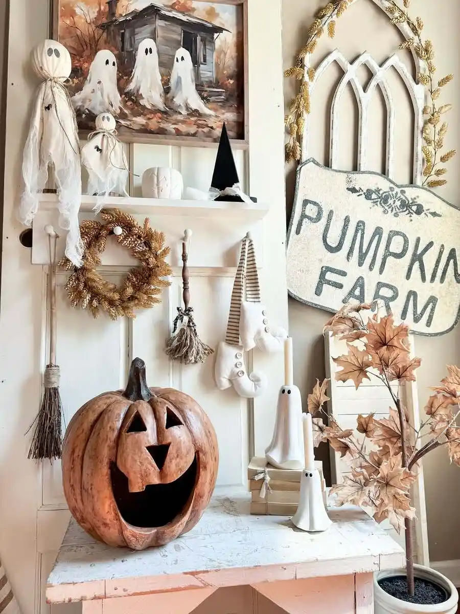This cozy farmhouse vignette reads witchy-cute. Gauzy cheesecloth ghosts dangle beside a rustic painting of an old cabin in fall leaves. A matte white jack-o’-lantern, a black cone hat, a wheat wreath, and a tiny straw broom keep the palette soft and neutral while giving ghost-story vibes.