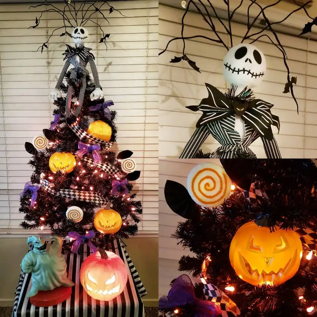 If you love a theme, commit. A Jack Skellington topper sprouts wiry branches over a black tinsel tree wrapped in orange lights. Checkerboard ribbon and purple bows dance with glowing pumpkin ornaments, candy-swirl disks, and a cheeky Oogie Boogie figure.