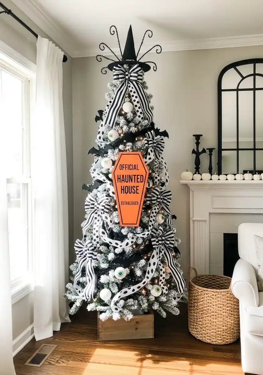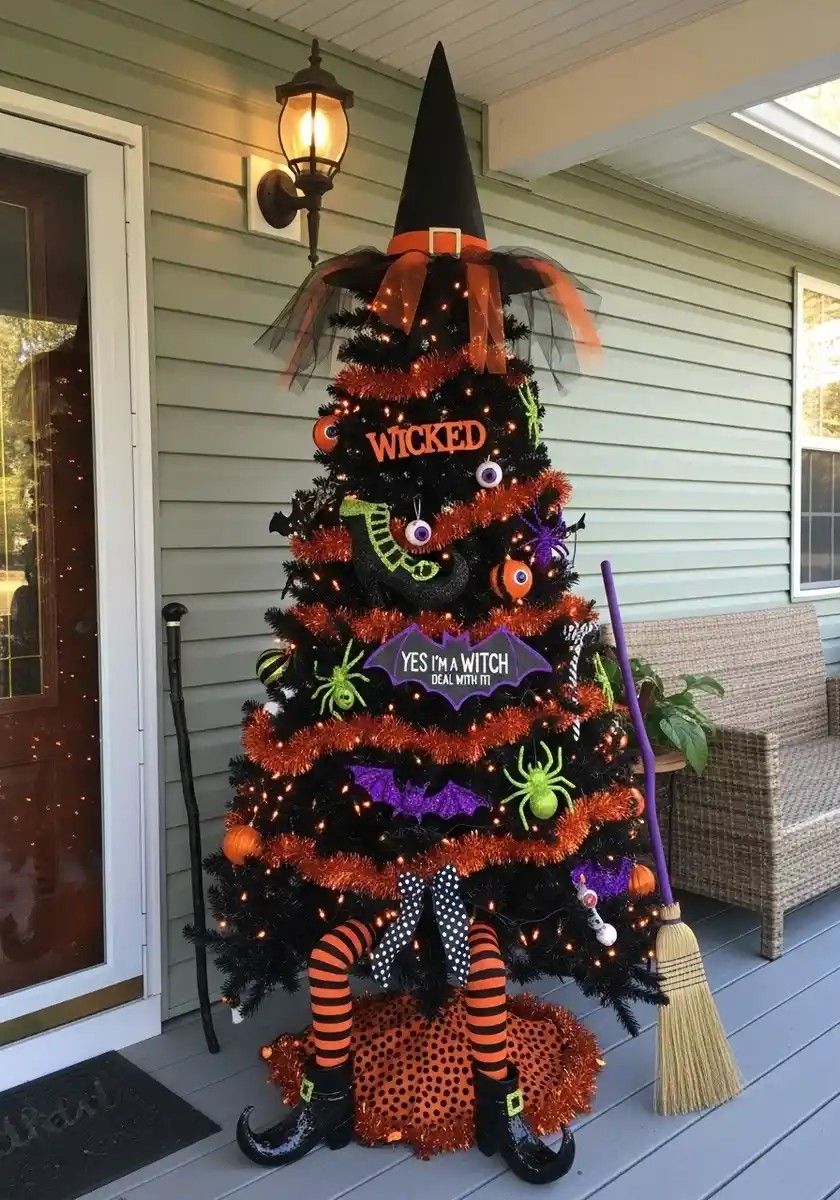 Build a showpiece for treat night. Top a black tree with a witch hat, then stick striped stockings into the branches like the witch is mid-spell. Add marquee BOO letters at the base and a glitter spider crawling nearby. Round signs and checkered ornaments keep it crisp.