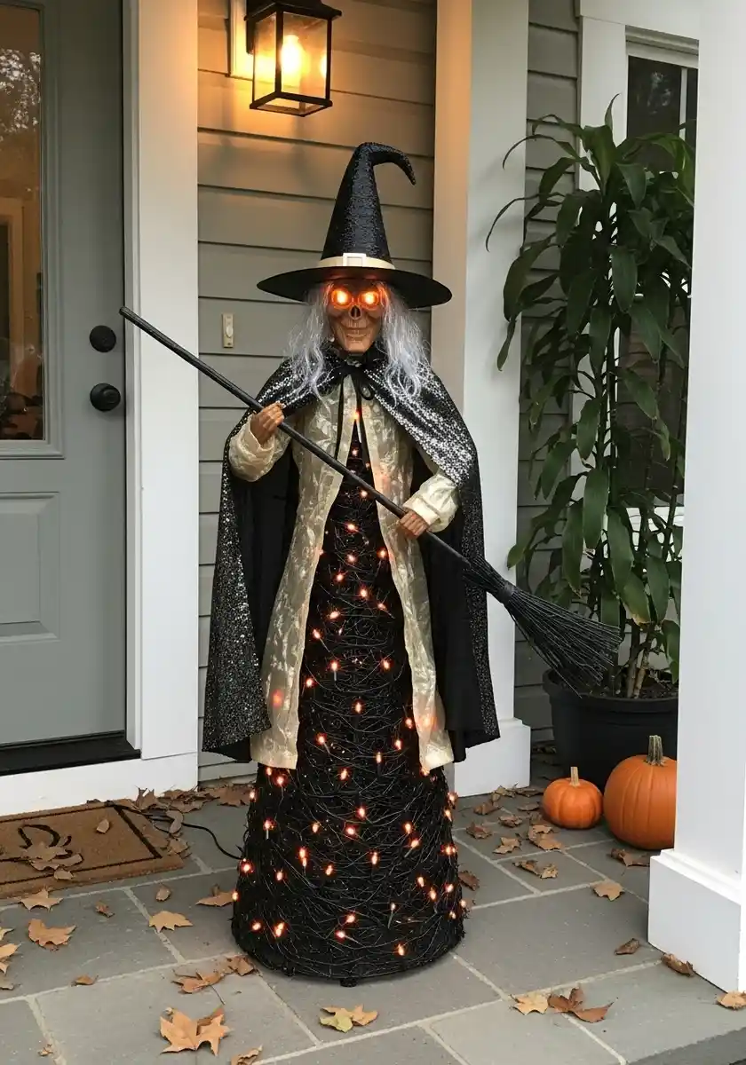 Place a full witch figure by the front door. Her glowing eyes and cape frame a dress laced with orange lights like a twinkling skirt. A broom in hand, a couple of pumpkins nearby, and leaves underfoot tell the story fast.