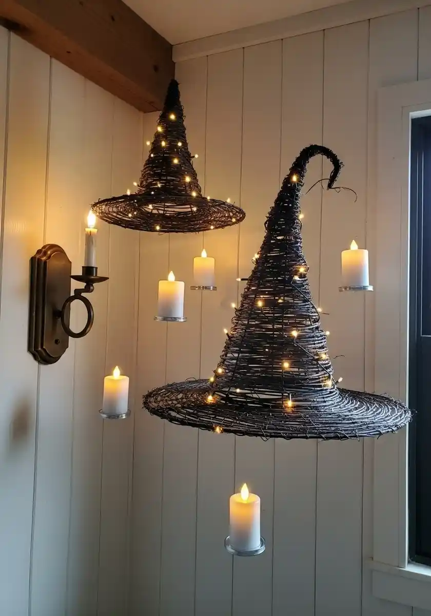 In a hallway, hang woven black witch hats at staggered heights and wrap them with fairy lights. Mix in flameless floating candles on thin fishing line so they appear to hover. The glow feels like you’re walking through a potion classroom.