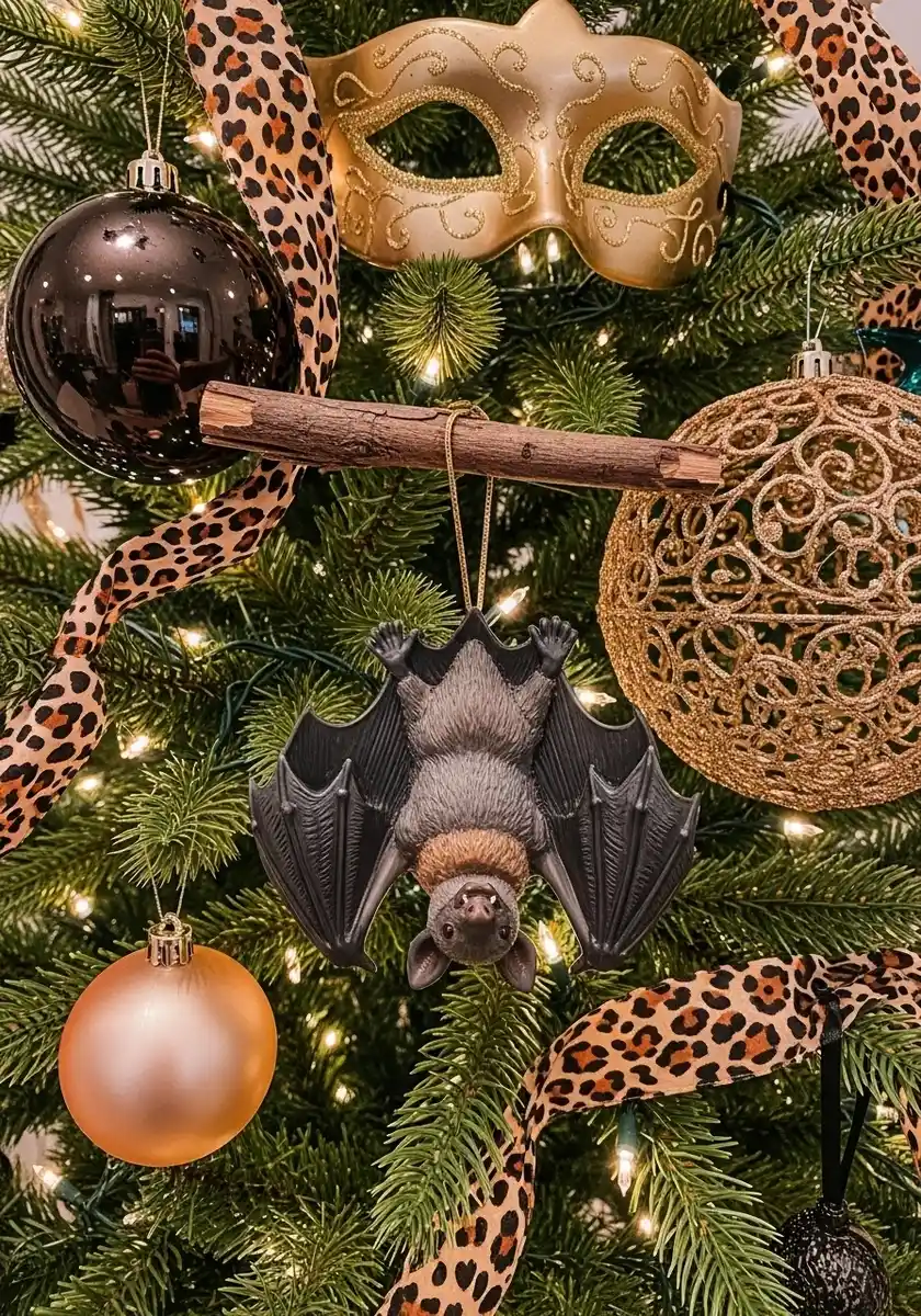 On a classic green tree, hang an upside-down bat from a small twig, then surround it with glossy black globes and filigree gold balls. Snake a leopard ribbon across the branches and tuck in a gold masquerade mask for theater flair.