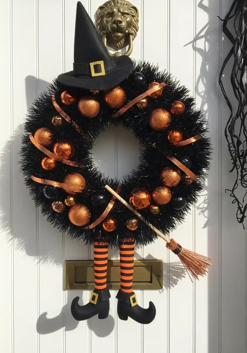 Finish with the front door. Build a fluffy black tinsel wreath packed with orange ornaments and ribbon. Perch a pointed hat on top. Dangle striped orange-and-black legs with curled buckle shoes at the bottom. Cross a tiny broom over the front as if she just landed.