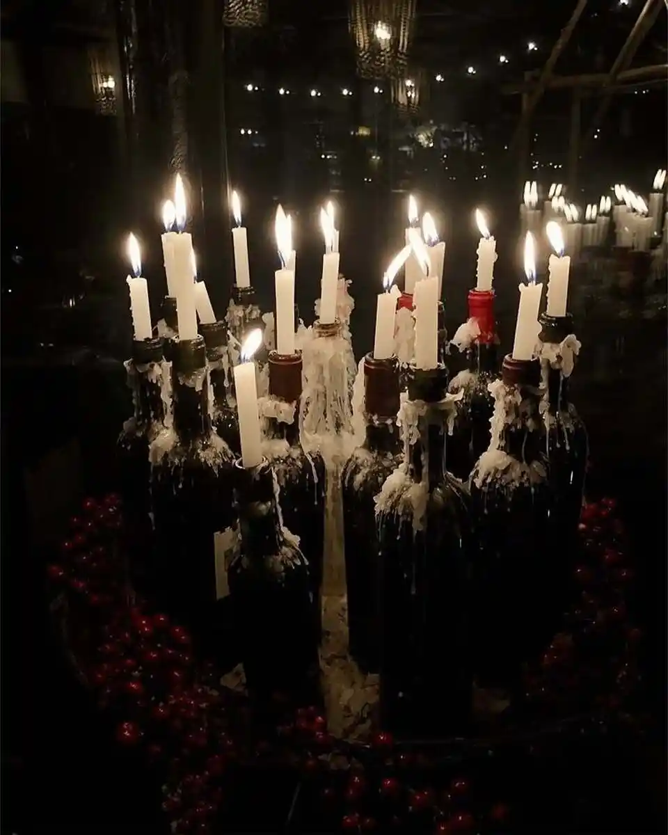 Save a dozen old wine bottles, cluster them into a ring, and fit slender tapers on top. Let the wax drip like crazy. The result is a dramatic altar that throws a medieval glow across your dining room. A ring of dark berries at the base hints at potion ingredients.