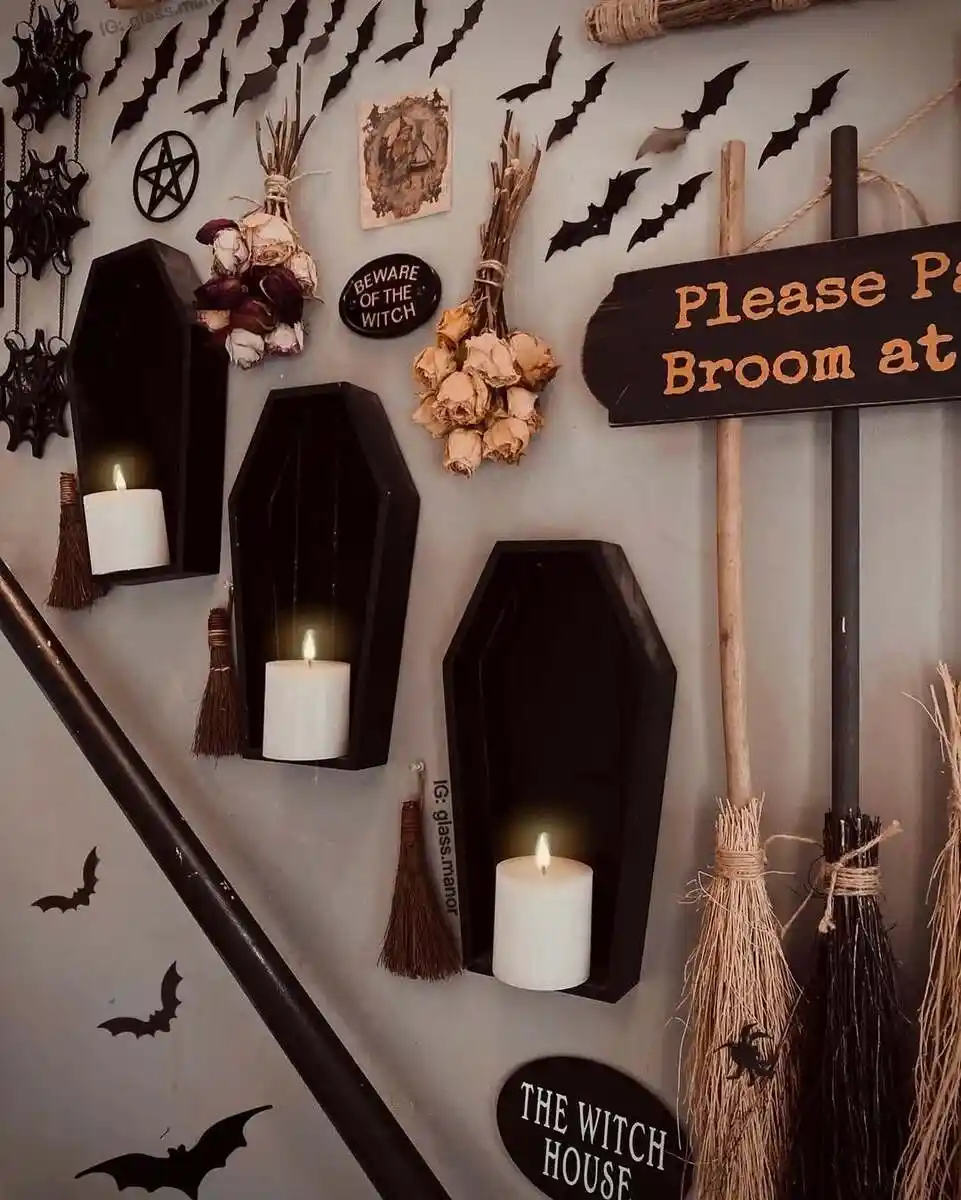 Turn a ho-hum stair wall into a spell corridor. Coffin-shaped shelves hold pillar candles while broomsticks, dried roses, and flying bats march up the steps. Little plaques with witchy sayings add humor. Stick to matte black with natural straw and kraft brown so it stays cohesive, not messy.