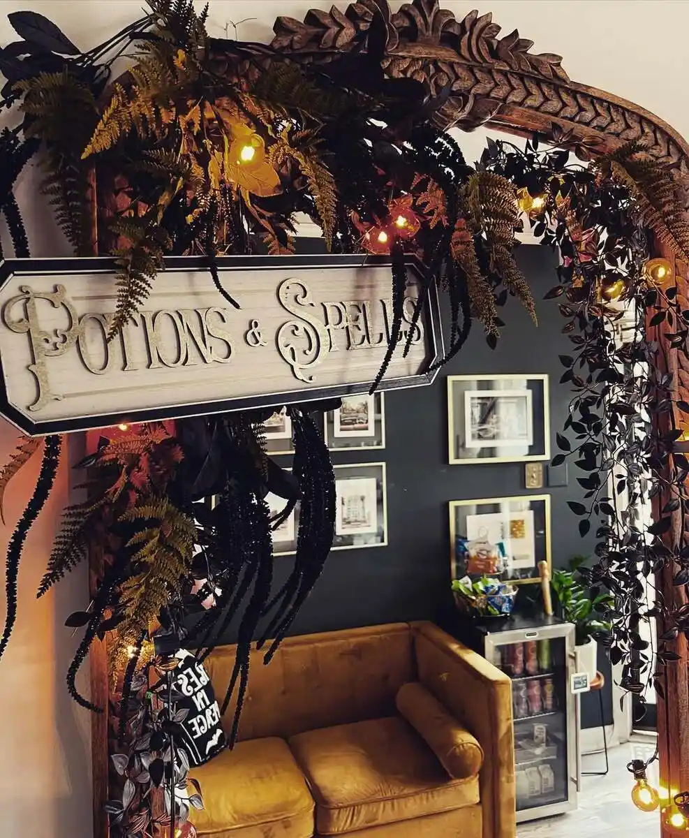 A carved mirror becomes a portal when you swag it with trailing black vines, ferns, and micro lights. A “Potions & Spells” sign tells the whole story, and the warm bulbs bounce off brass candlesticks for that alchemist glow. Park a mustard velvet sofa under it and the color temperature sings.