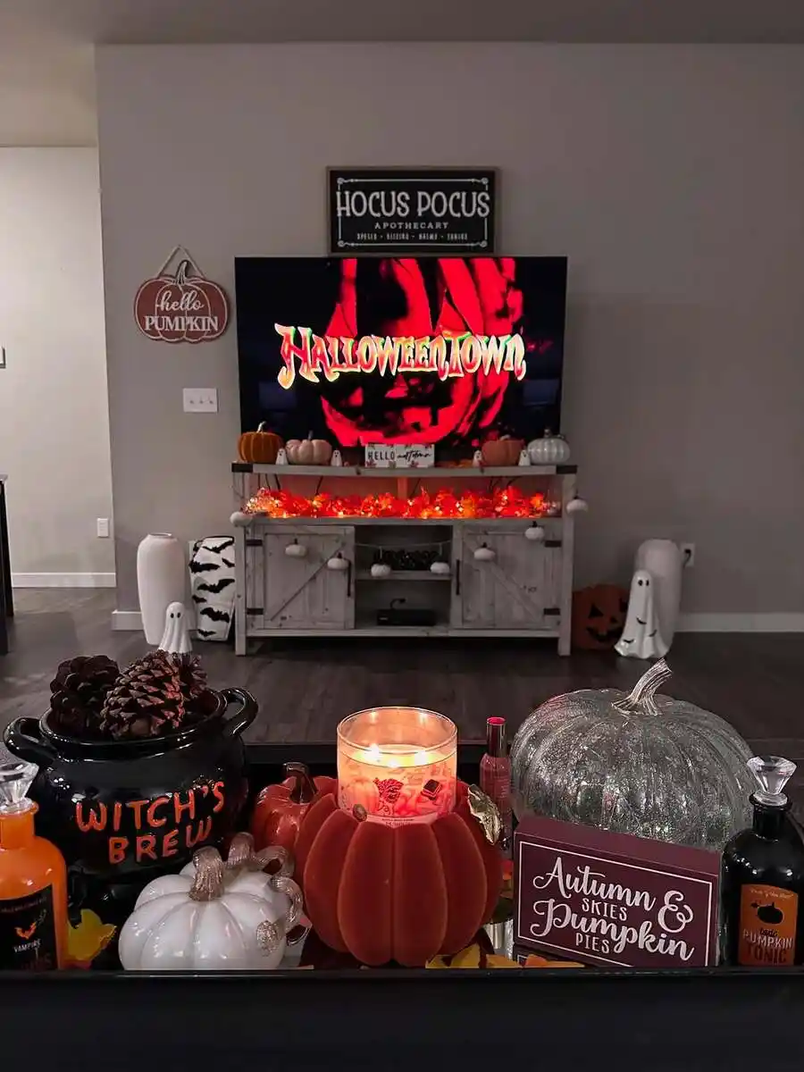 Even movie snacks can feel enchanted. On the console, mix potion bottles, velvet pumpkins, pinecones, and one glowing candle. Keep the color story to black, ember orange, and a little silver. Put on your favorite classic and let the room do the rest.