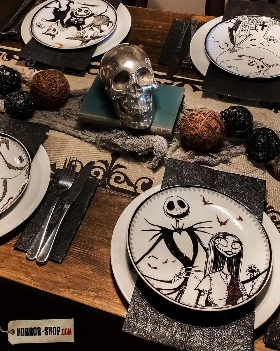 Set plates inspired by The Nightmare Before Christmas on black napkins and a scroll-print runner. Center a silver skull on stacked books, then scatter rattan balls and gauzy cheesecloth for texture. It’s edgy but still dinner-friendly.
